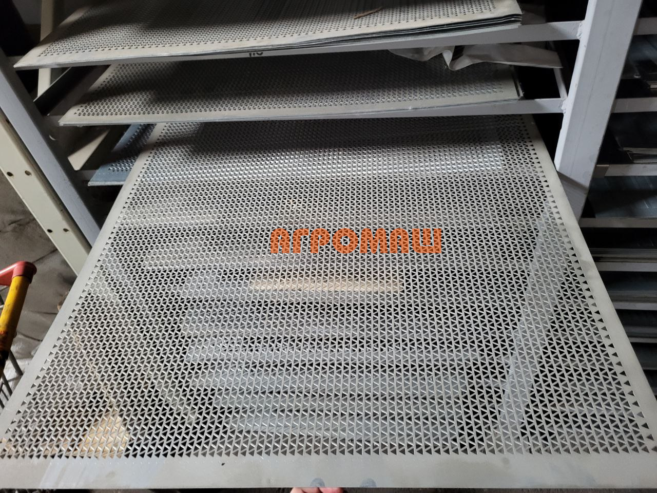 Сепарационные возможности ячейки 4,5 мм: равносторонние треугольные проходы со стороной 4,5 мм отделяют плоские примеси средней фракции — семена вьюнка полевого, горца почечуйного, дикого овса, осота и фрагменты плёночных оболочек размером до 4,5 мм. Промежуточный размер между 4,0 мм и 5,0 мм позволяет точно настроить разделение фракций при работе с ворохом неоднородной засорённости. Треугольная конфигурация ячеек создаёт направленный сепарирующий эффект: при вибрации плоские частицы ориентируются параллельно поверхности решета и проходят через проходы, тогда как зёрна пшеницы, ржи, ячменя и овса удерживаются на рабочей плоскости. Элемент размещается в средней секции решётного пакета после предварительной калибровки круглыми отверстиями 6,0–6,5 мм и щелевыми решётами 2,8–3,0 мм.